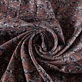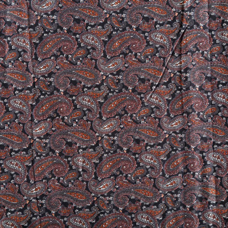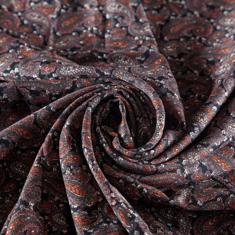 Плотная и мягкая ткань черного цвета с серо-коричневым узором пейсли, имеет саржевое плетение и характерный диагональный рубчик на поверхности. Отлично сохраняет форму, не сильно мнется и не деформируется в процессе эксплуатации. Красиво ложится в складки, поэтому прекрасно подойдет на длинные драпированные юбки и платья, на свободные брюки или шорты, топы.