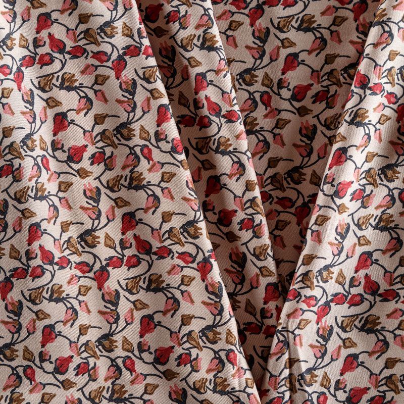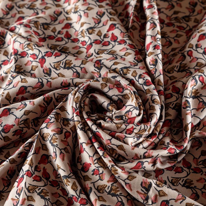 Плотная и мягкая ткань песочного оттенка с мелкоцветным принтом, имеет саржевое плетение и характерный диагональный рубчик на поверхности. Отлично сохраняет форму, не сильно мнется и не деформируется в процессе эксплуатации. Красиво ложится в складки, поэтому прекрасно подойдет на длинные драпированные юбки и платья, на свободные брюки или шорты, топы.