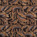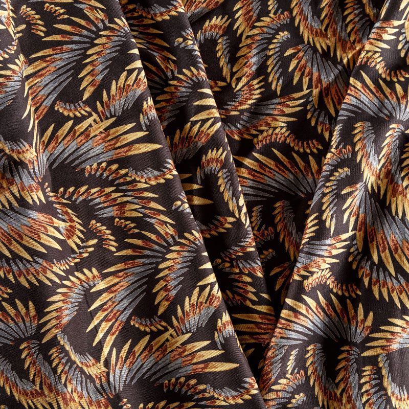 Плотная и мягкая ткань черного цвета с фантазийным принтом, имеет саржевое плетение и характерный диагональный рубчик на поверхности. Отлично сохраняет форму, не сильно мнется и не деформируется в процессе эксплуатации. Красиво ложится в складки, поэтому прекрасно подойдет на длинные драпированные юбки и платья, на свободные брюки или шорты, топы.