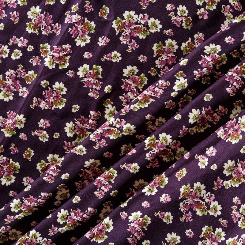Плотная и мягкая ткань темно-сливового оттенка с ярким мелкоцветом, имеет саржевое плетение и характерный диагональный рубчик на поверхности. Отлично сохраняет форму, не сильно мнется и не деформируется в процессе эксплуатации. Красиво ложится в складки, поэтому прекрасно подойдет на длинные драпированные юбки и платья, на свободные брюки или шорты, топы.