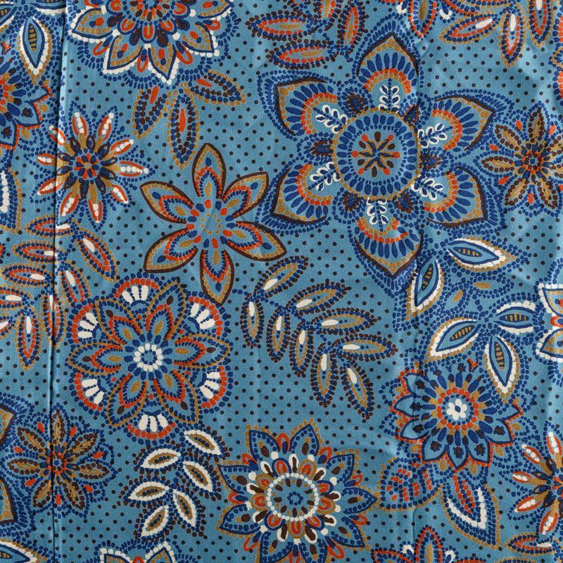 Плотная и мягкая ткань голубого оттенка со стилизованным цветочным орнаментом, имеет саржевое плетение и характерный диагональный рубчик на поверхности. Отлично сохраняет форму, не сильно мнется и не деформируется в процессе эксплуатации. Красиво ложится в складки, поэтому прекрасно подойдет на длинные драпированные юбки и платья, на свободные брюки или шорты, топы.