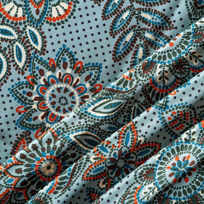Плотная и мягкая ткань мятно-зеленого оттенка со стилизованным цветочным орнаментом, имеет саржевое плетение и характерный диагональный рубчик на поверхности. Отлично сохраняет форму, не сильно мнется и не деформируется в процессе эксплуатации. Красиво ложится в складки, поэтому прекрасно подойдет на длинные драпированные юбки и платья, на свободные брюки или шорты, топы.