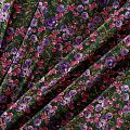 Плотная и мягкая ткань темно-зеленого цвета с ярким цветочным принтом в розово-фиолетовых оттенках, имеет саржевое плетение и характерный диагональный рубчик на поверхности. Отлично сохраняет форму, не сильно мнется и не деформируется в процессе эксплуатации. Красиво ложится в складки, поэтому прекрасно подойдет на длинные драпированные юбки и платья, на свободные брюки или шорты, топы, комбинезоны, а также для домашней одежды.