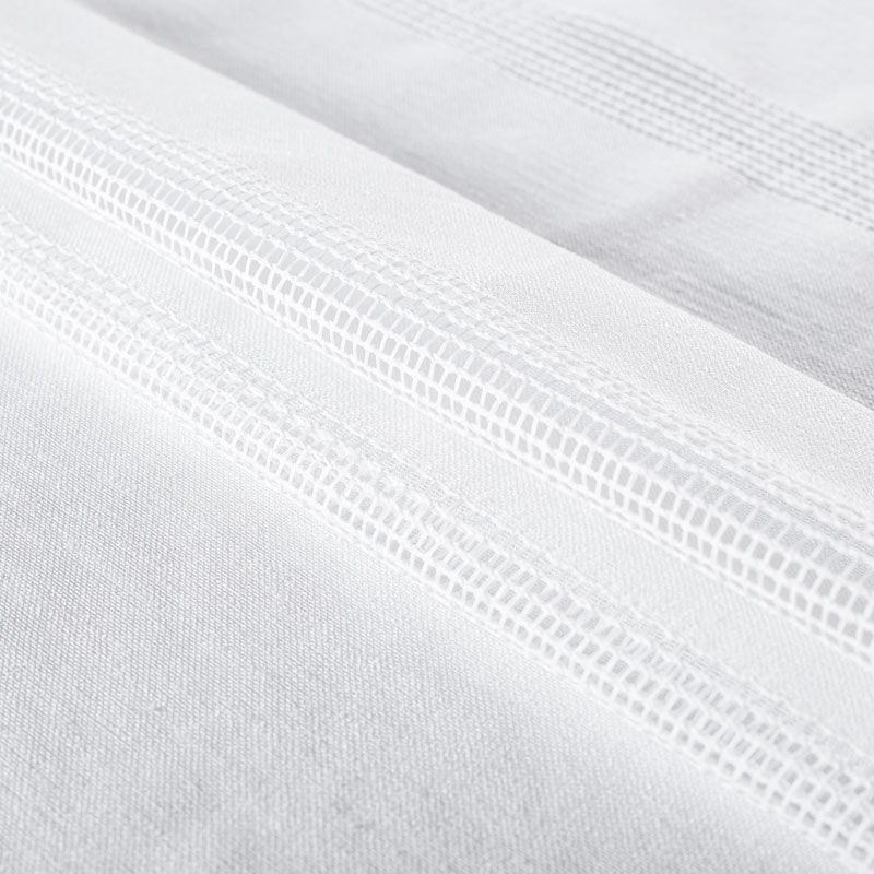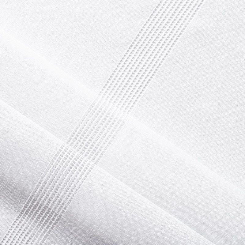 Тюль имитирующий текстуру натурального льна декорирован горизонтальной мережкой, расположенной по всей высоте ткани.