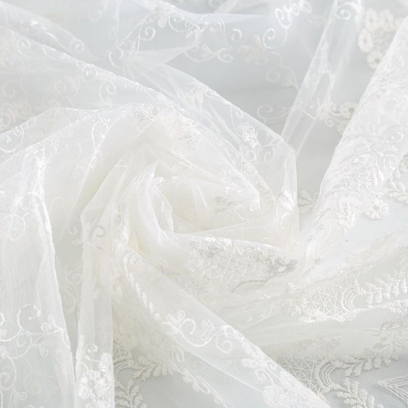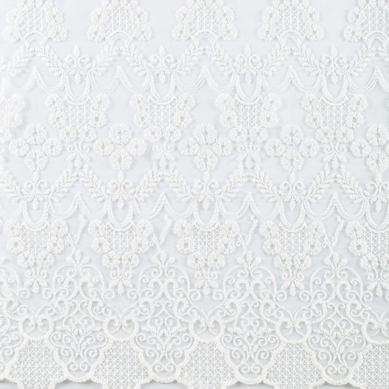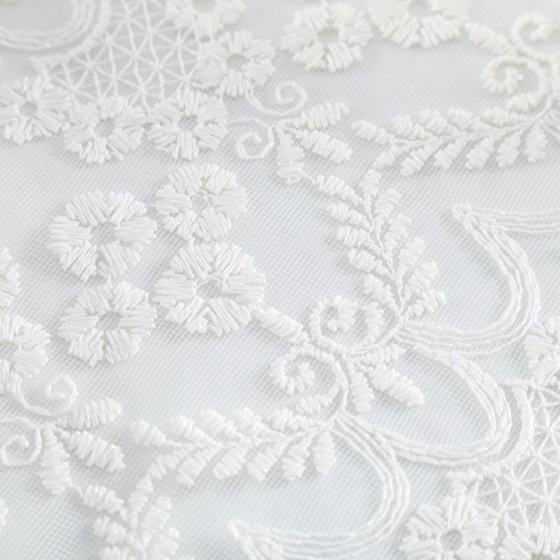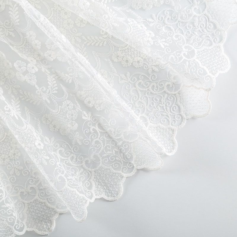 Сетка с вышивкой – это роскошный элемент дизайна, который преобразит любое помещение. Она отлично пропускает воздух, поэтому быстро сохнет после стирки. Прочная, ткань прослужит долго. Выдерживает большое количество стирок. Легкая, фактура ткани практически невесома, поэтому можно не опасаясь крепить ее даже на самый тонкий карниз. Вышивка в виде вензелей кремового цвета с добавлением люрекса расположена по всей высоте ткани, нижний край украшен более насыщенной купонной вышивкой, без утяжелителя, фигурный.