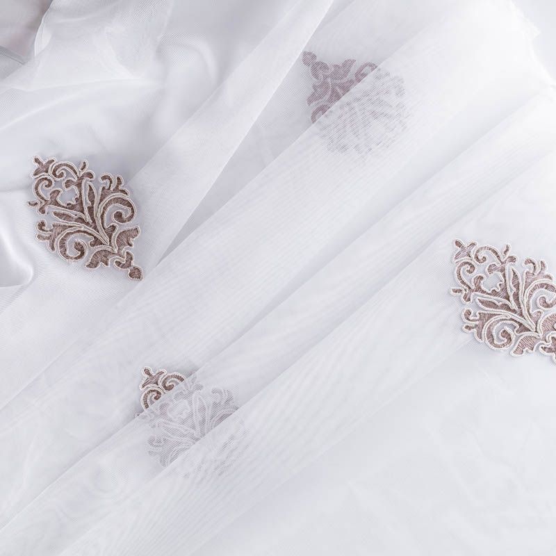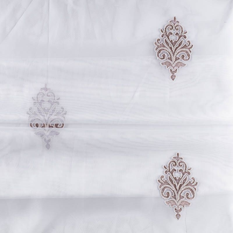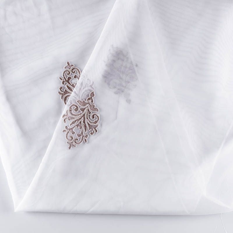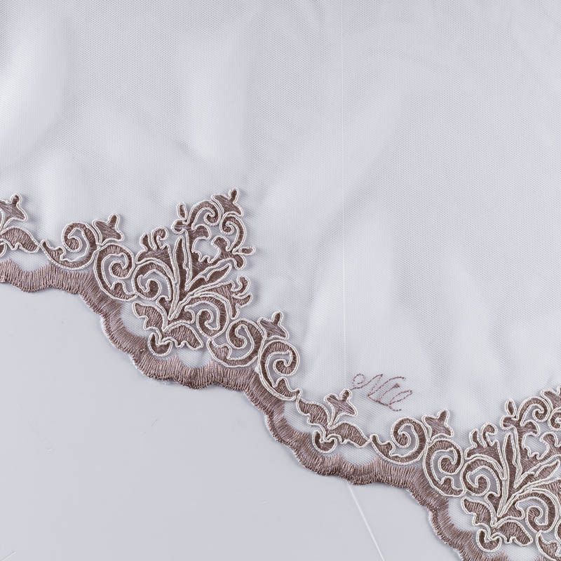 Сетка с вышивкой – это роскошный элемент дизайна, который преобразит любое помещение. Она отлично пропускает воздух, поэтому быстро сохнет после стирки. Прочная, ткань прослужит долго. Выдерживает большое количество стирок. Легкая, фактура ткани практически невесома, поэтому можно не опасаясь крепить ее даже на самый тонкий карниз. Сутажная элегантная вышивка приятного коричневатого оттенка в виде "дамасков" расположена по всей высоте ткани, нижний край украшен вышитым фестоном, без утяжелителя, фигурный.