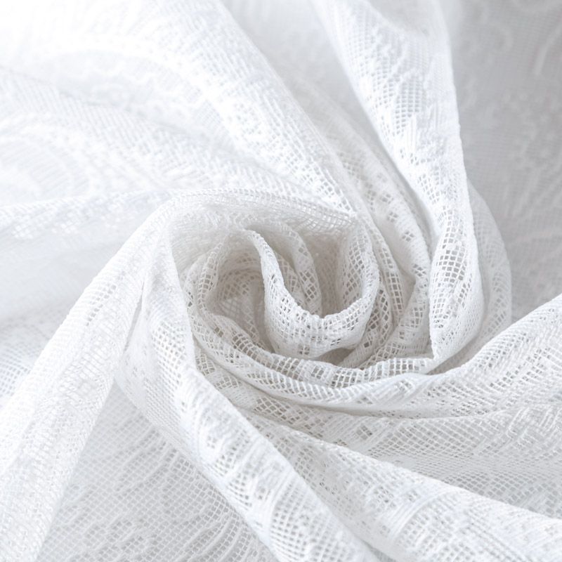 Красивая, нежная и легкая полупрозрачная сетка  с фактурным рисунком. Ткань прекрасно драпируется, образует ровные складки. Гармонично смотрится в разном интерьере: от классики до хай-тека. Жаккардовый рельеф и нитяные вышитые узоры придают свой колорит, создавая легкую изысканную атмосферу в помещении. Такой тюль очень практичен, его легко и быстро стирать и гладить, он практически не мнется.