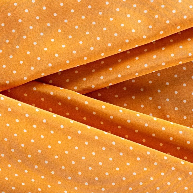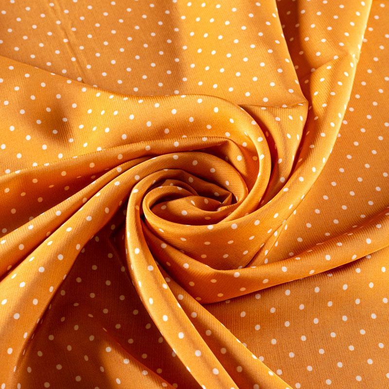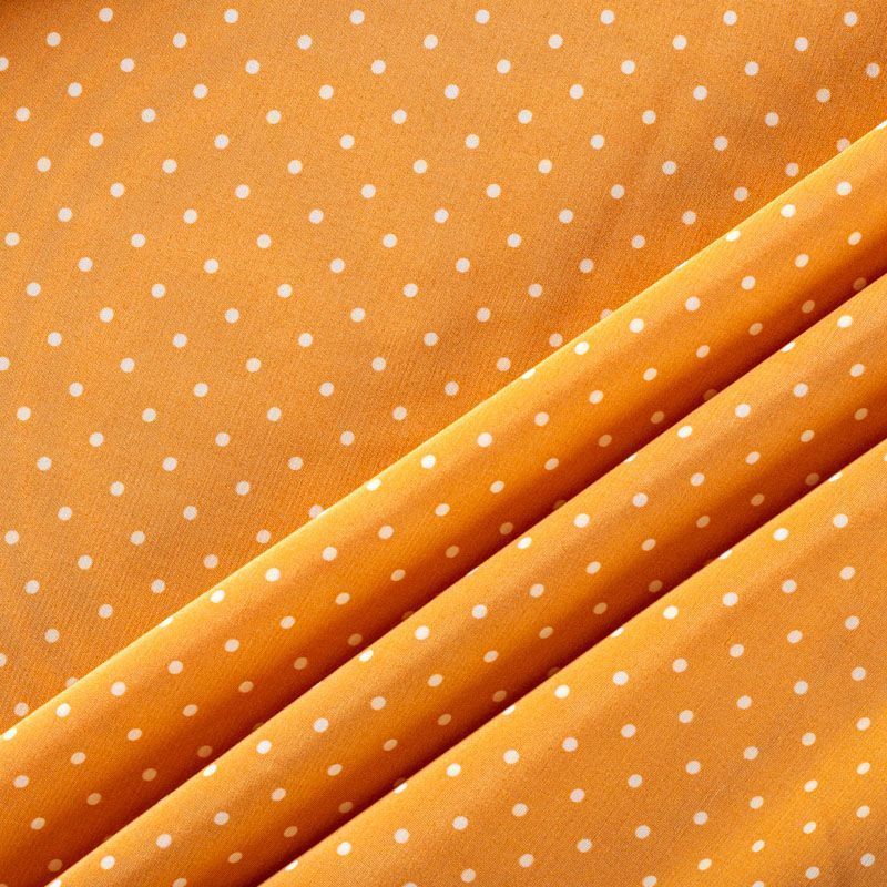 Плательно-рубашечная итальянская вискоза в оттенке охры с принтом в мелкий горошек. Натуральная, дышащая ткань, очень приятная к телу, отлично драпируется, струится, не просвечивает. Хорошо подойдет для пошива платьев, рубашек, платьев-рубашек, блуз, юбок, брюк, летних костюмов, пыльников, детской одежды.