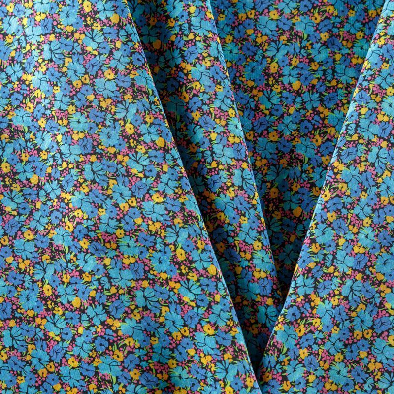 Итальянская плательно-блузочная вискоза с ярким мелкоцветным принтом на черном фоне. Ткань очень пластичная, отлично драпируется и струится, мягкая и приятная на ощупь, не просвечивает. Прекрасно подойдет для пошива платья, рубашки, топа, блузки, юбки, летнего костюма.