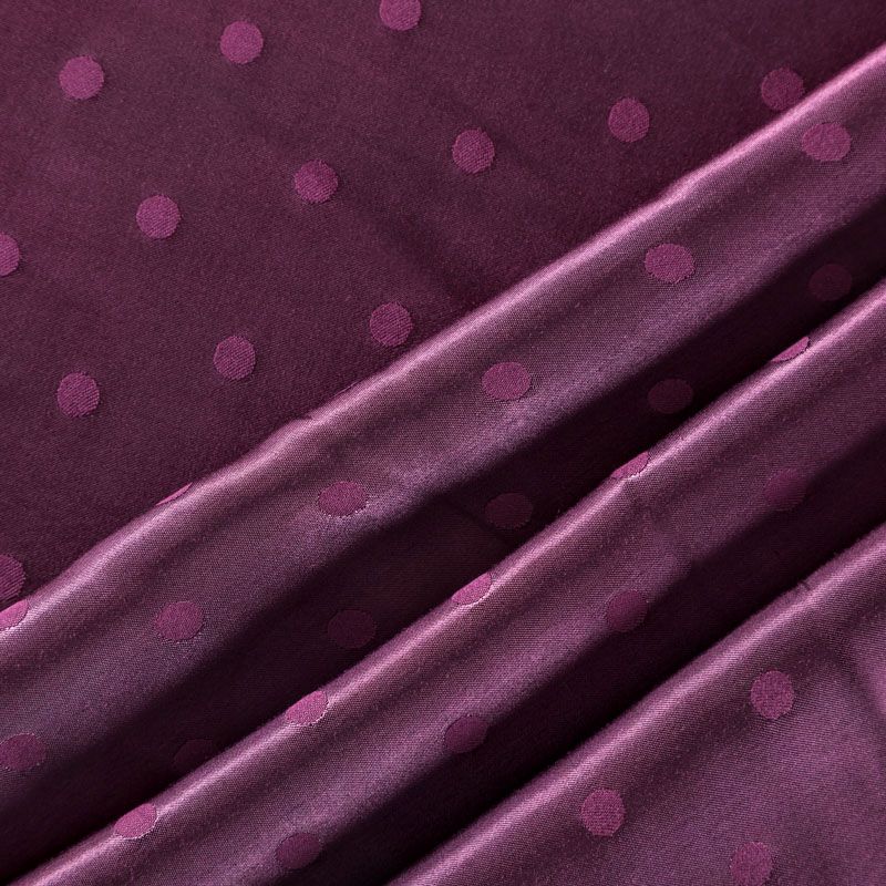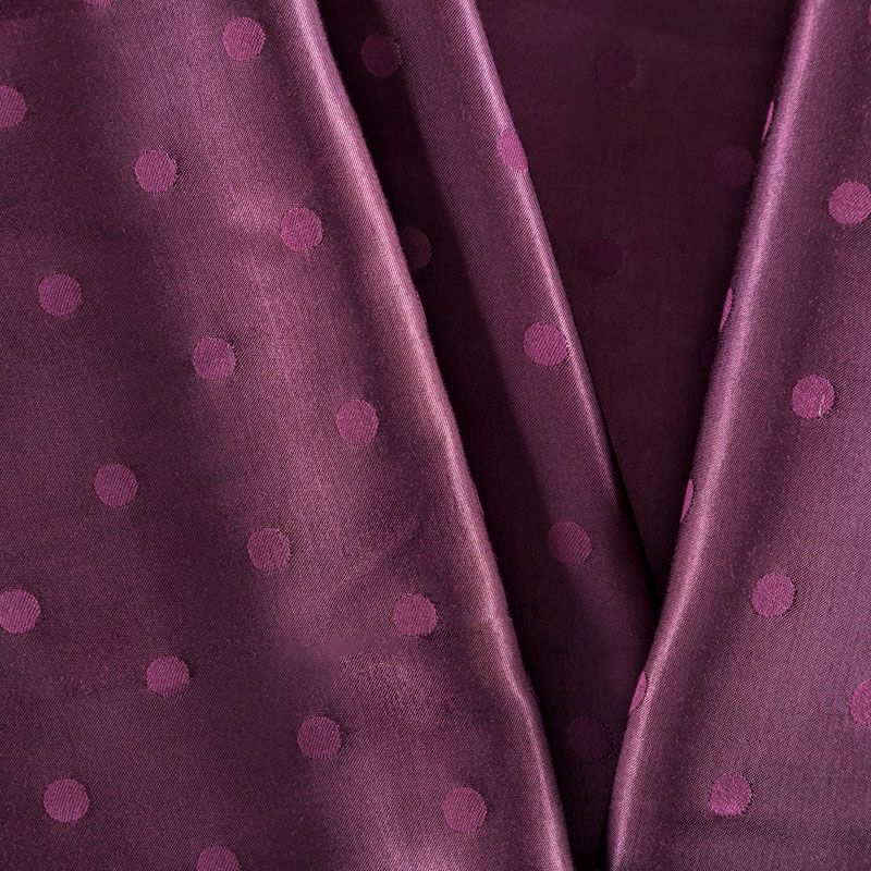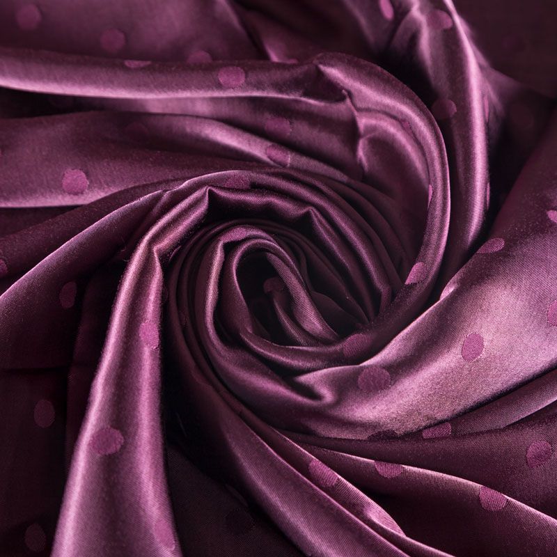Атласная жаккардовая вискоза фиолетового оттенка. Ткань плотная, но пластичная, хорошо драпируется и струится. Поверхность ткани гладкая, атласная, приятная на ощупь. Подойдет для пошива платья, сарафана, топа, блузки, рубашки, юбки, костюма в пижамном стиле, брюк свободного кроя, а также как подклад для верхней одежды.