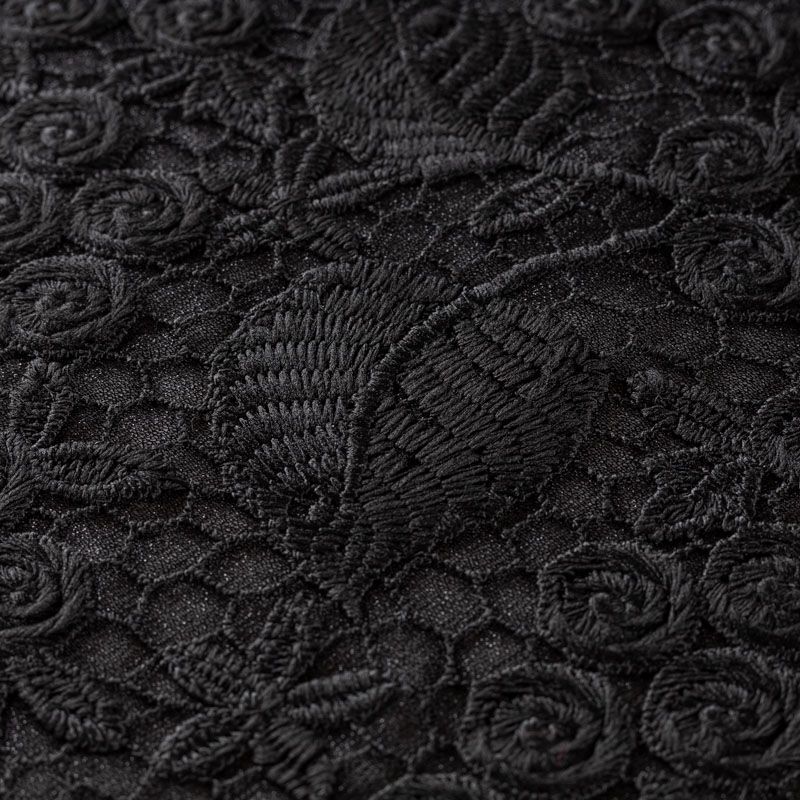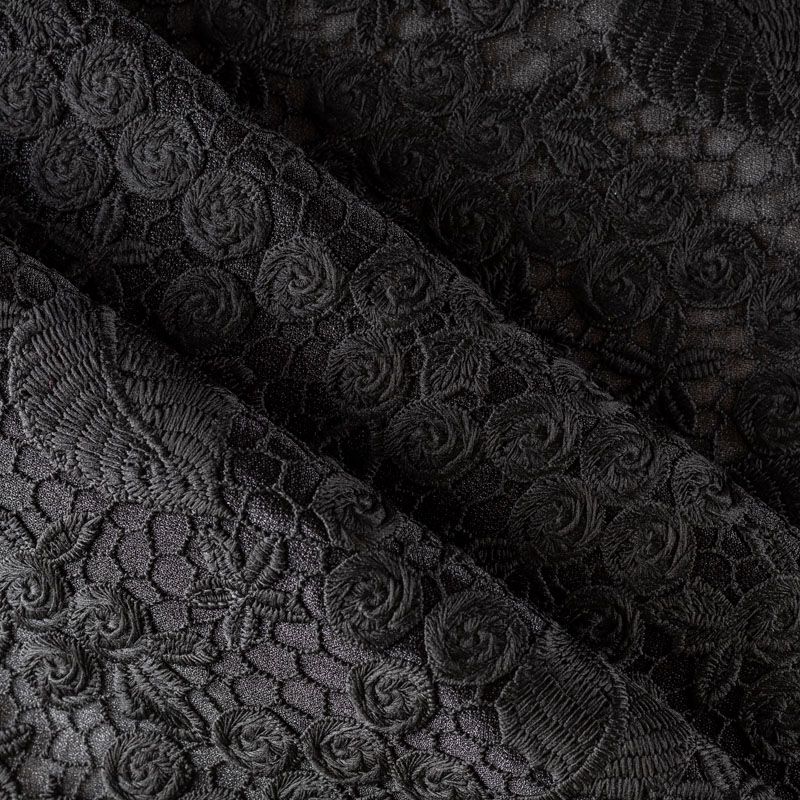 Очень эффектная вышивка на сетчатной основе черного цвета с мелкой ячейкой, мягкая и пластичная. Вышивка с флористическим орнаментом в тон основе, плотная, расположена по всем полотну. Ткань приятная к телу, не колется, не цепляется. Идеальна для эффектных вечерних нарядов и для повседневного образа в виде платья-футляра, топа, блузки, летнего жакета, кардигана, брюк или шорт. Требуется подклад.