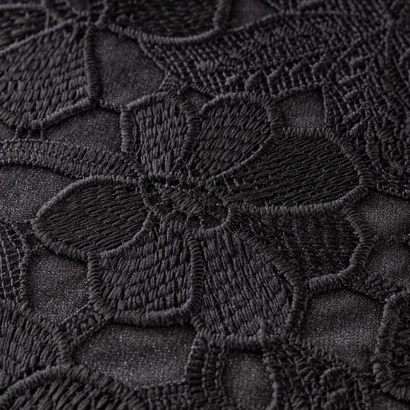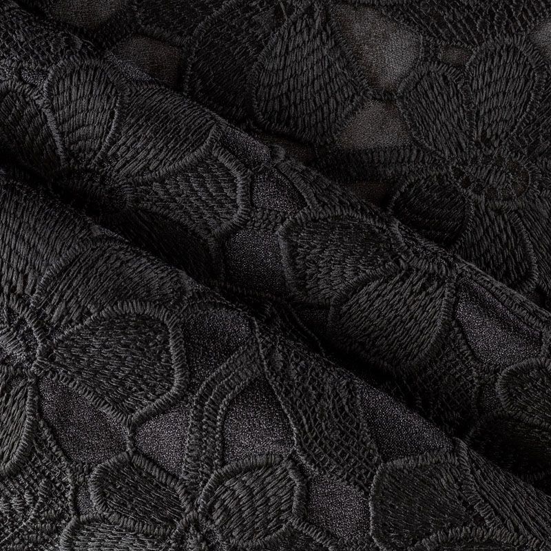 Очень эффектная вышивка на сетчатной основе черного цвета с мелкой ячейкой, мягкая и пластичная. Вышивка с цветочными мотивами в тон основе, плотная, расположена по всем полотну. Ткань приятная к телу, не колется, не цепляется. Идеальна для эффектных вечерних нарядов и для повседневного  образа в виде платья-футляра, топа, блузки, летнего жакета, кардигана, брюк или шорт. Требуется подклад.