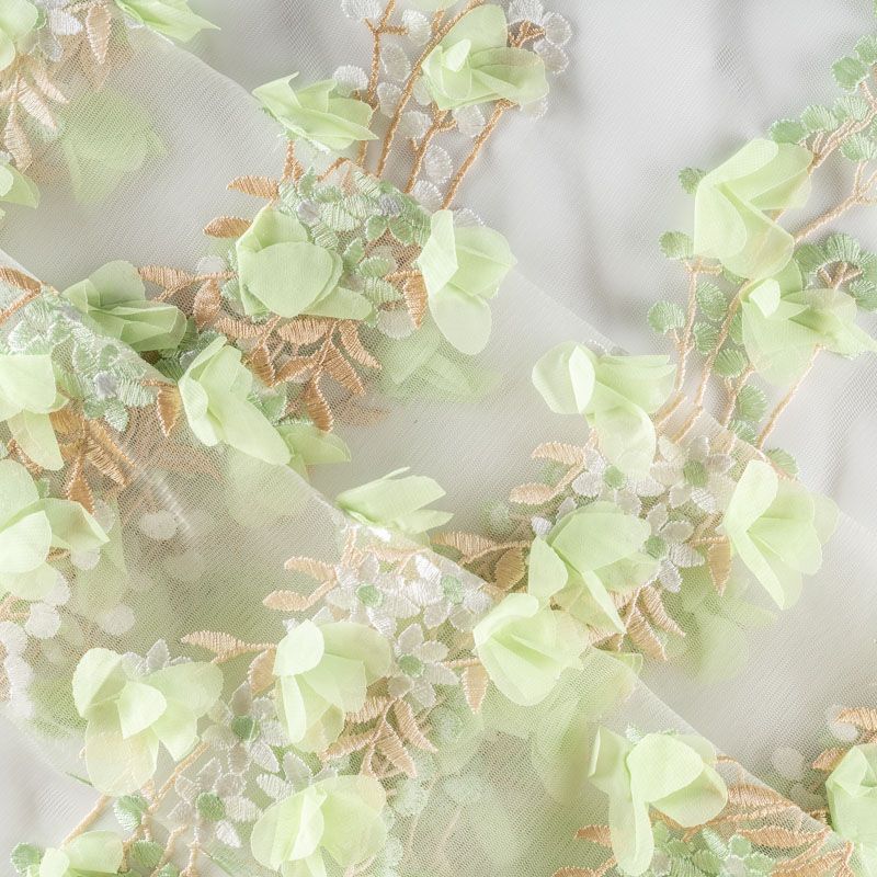 Необычная вышивка на сетке с 3D эффектом - воздушный, пластичный, трогательный купон на сетке основе молочного цвета. Оттенок смотрится благородно, а цветы из нежного шифона салатового цвета подвижны и создают весеннее настроение.