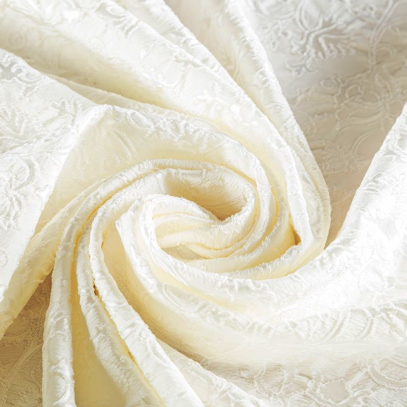 Итальянский жаккард молочного оттенка с изящным цветочным орнаметом. Ткань мягкая и пластичная, держит форму, хорошо драпируется. Повехность фактурная, матовая. Подойдет для создания вечерних  и свадебных платьев, нарядных костюмов, жакетов, юбок, корсетов, шорт.