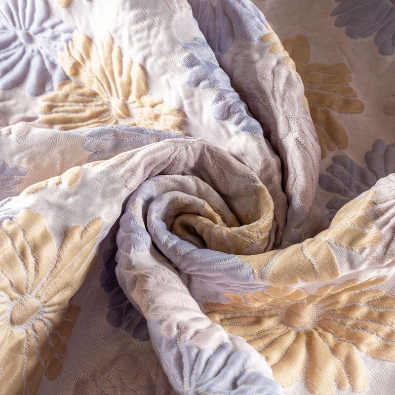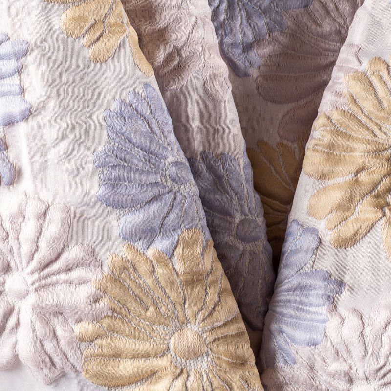 Итальянский жаккард с нежным и романтичным дизайном из фактурных ромашек голубого, светло-желтого и розового оттенков. Ткань легкая, но плотная, поверхность матовая, объемная и текстурная, хорошо драпируется и держит форму, не тянется, не просвечивает. Подойдет для пошива нарядных вечерних костюмов, платьев-футляров в стиле Dior, жакетов, топов, летних пальто, бомберов, юбок или шорт.