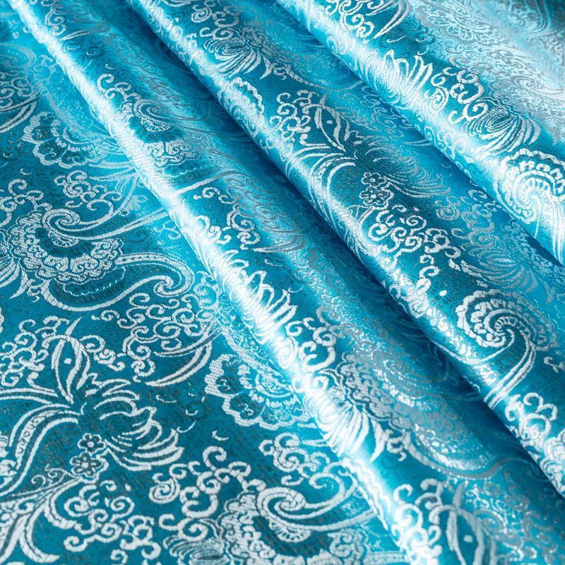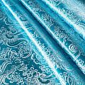 Насыщенная ткань плотного переплетения с декоративной поверхностью, покрытая сложным орнаментом из блестящих нитей. Ткань легкая, отлично драпируется, держит форму, отличается прочностью, долговечностью, износостойкостью и простотой в уходе, не смотря на свою высокую декоративность. Нарядность ткани придает золотая люрексовая нить. Подходит для пошива юбок, платьев, топов, сценических костюмов.